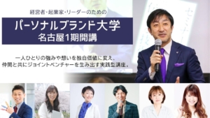 「パーソナルブランド大学・通学制(名古屋校)」を開講します。本講座では、起業家、リーダーが自身の内面に眠る強みや原体験を掘り起こし、